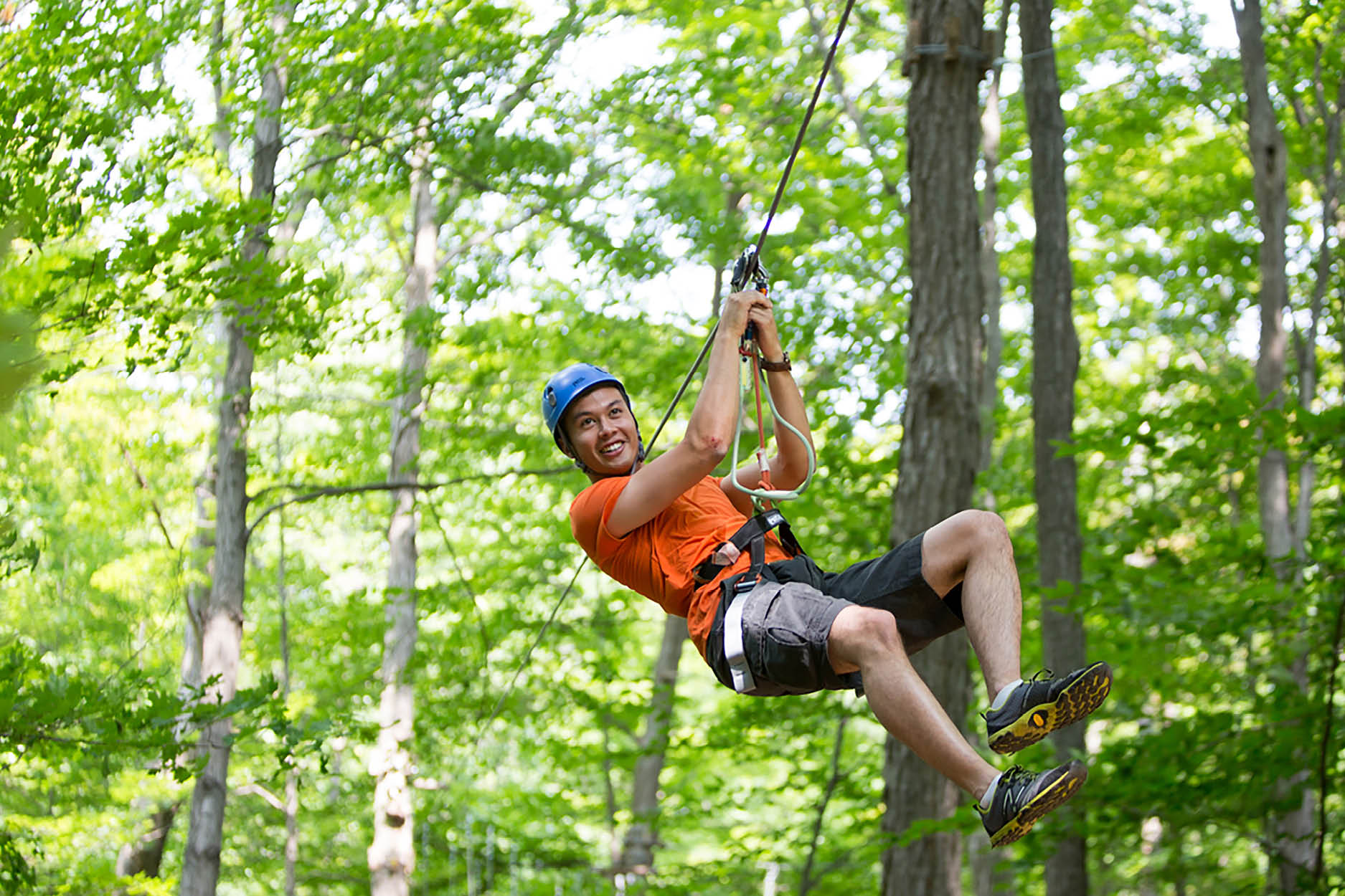 The Zipline and Aerial Game Trek for ages 9+ offers the opportunity to swing from tree to tree on a suspended bridge, swinging log, cable traverse, or zipline. Participants are outfitted with a harness and helmet as they climb and zip through the forest canopy.